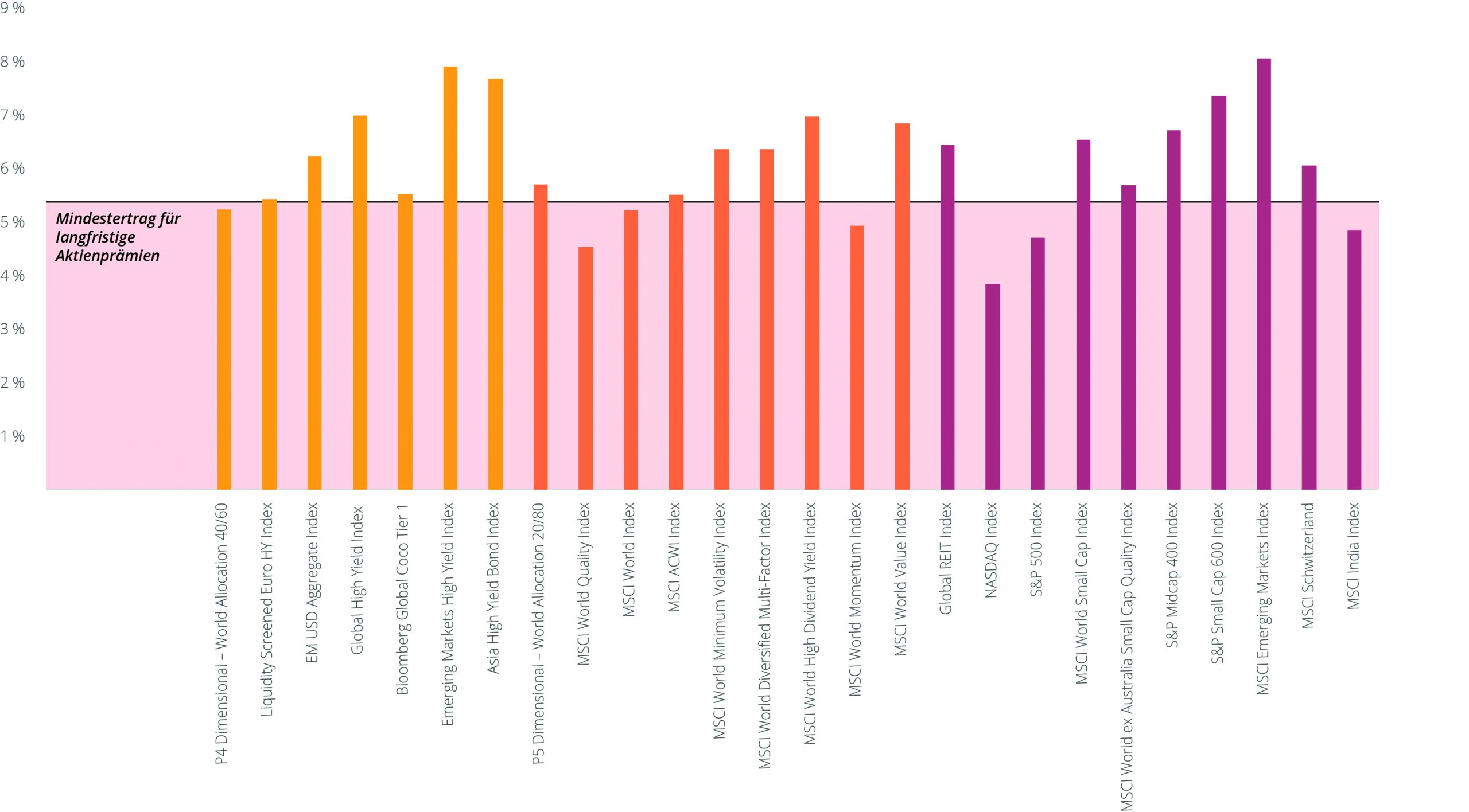 Ihr Risikoprämien sind von 5,5 & pro Jahr auf unter 4 Prozent gefallen. Auf diesem Niveau raten wir aktuell vom Kauf des S&P 500, Nasdaq 100, klassischer Technologiefonds oder des MSCI World Index ab. Interessanter ist derzeit der MSCI AC World IMI. Dieser ist breiter diversifiziert, enthält mehr kleinere Unternehmen und weist einen höheren Anteil an Schwellenländern auf.